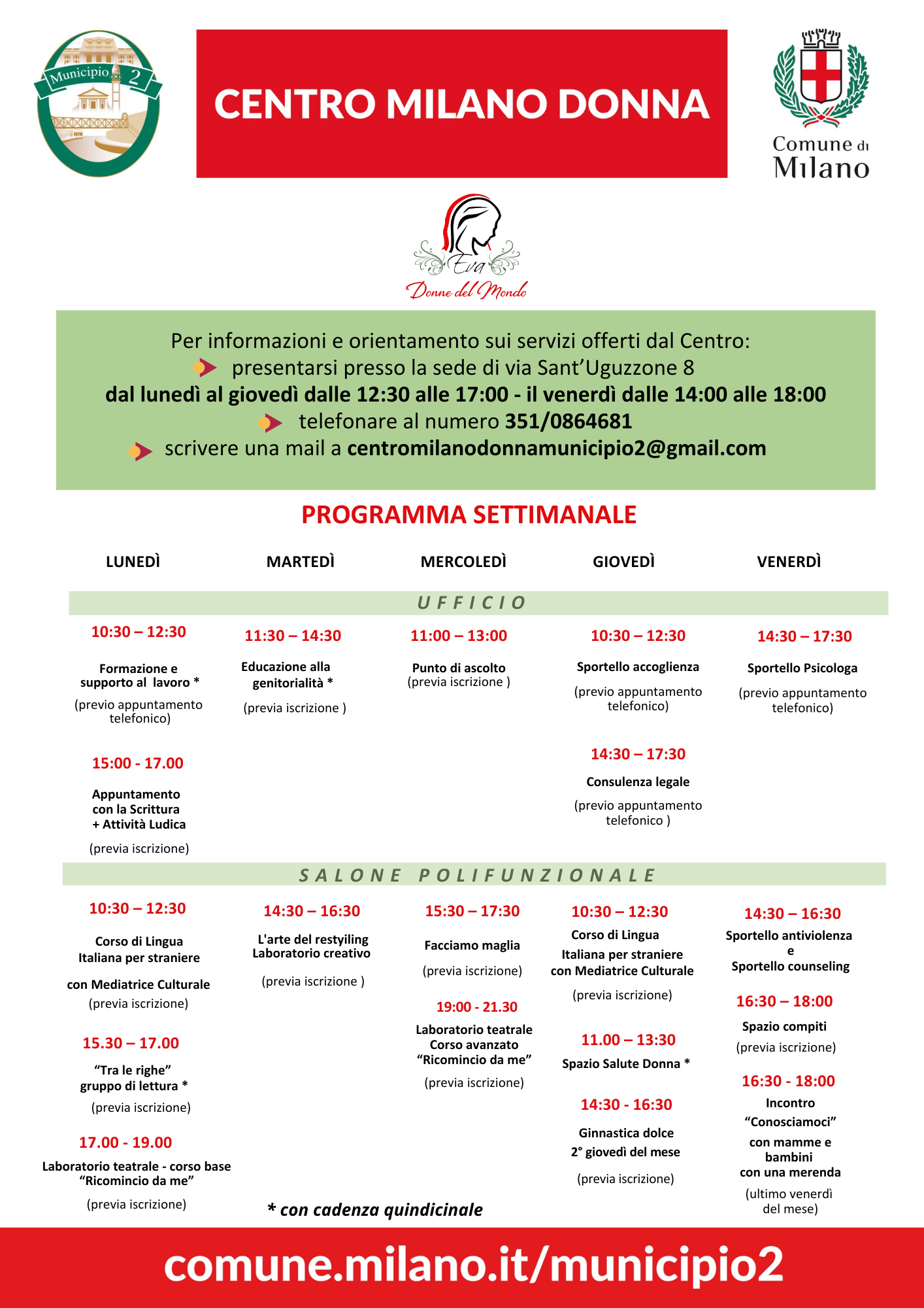 Per informazioni e orientamento sui servizi offerti dal Centro e su quelli presenti nel territorio, è possibile contattare gli Uffici dal lunedì al giovedì dalle 12:30 alle 17:00 e il venerdì dalle 14:00 alle 18:00 di persona presso la sede di via Sant’Uguzzone 8, oppure telefonicamente al numero 351 0864681. È possibile anche scrivere una mail a centromilanodonnamunicipio2@gmail.com