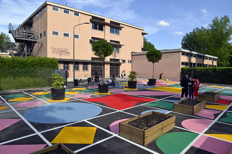 L’intervento di urbanistica tattica ha realizzato nell’area davanti alla scuola primaria dell’ICS Via Val Lagarina una nuova coloratissima piazza in quella che prima era una zona adibita a parcheggio. L’originale e ambizioso pattern è stato ideato dalla Designer Serena Confalonieri a seguito di un percorso partecipativo con la scuola e gli altri firmatari del patto.